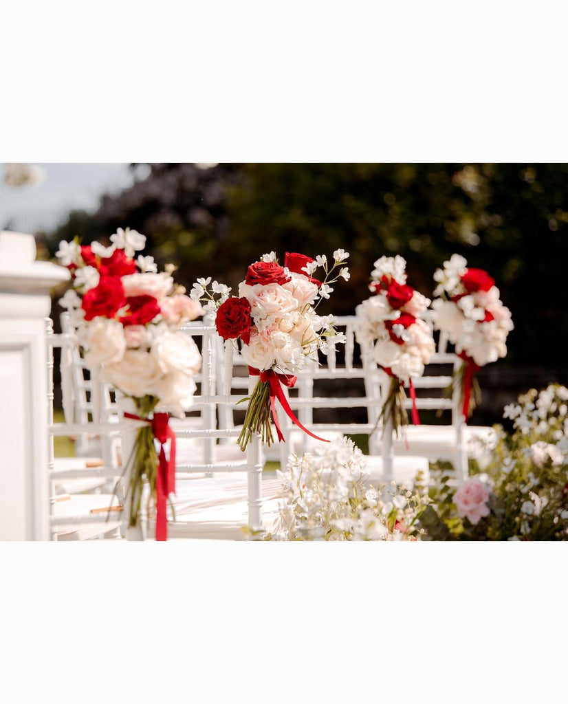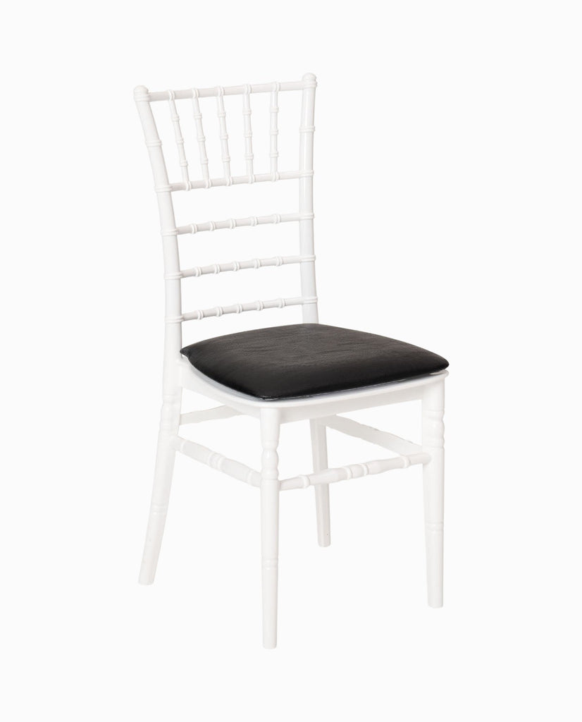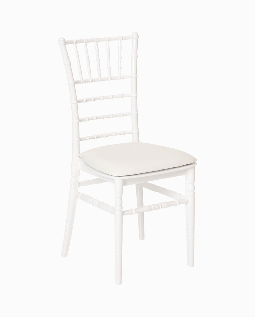 Kunststof Chiavari stoel wit, de zitting is comfortabel met een kussentje. Voeg de stoelkussen lichtbeige of rood toe aan deze stoel.