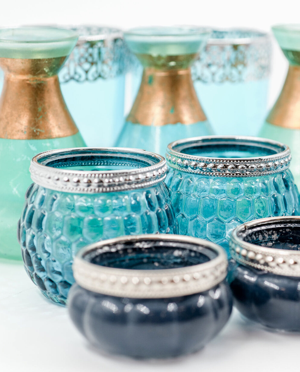 Mix-and-match set in blue with silver or gold details. These tea lights and vases are available in various colors. Fun to mix and match.