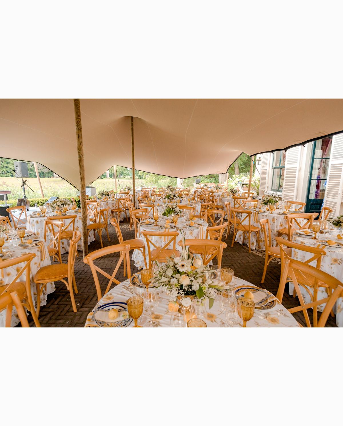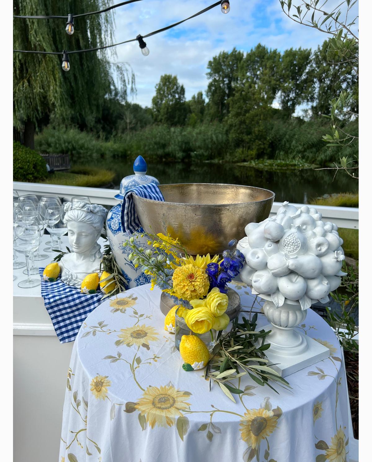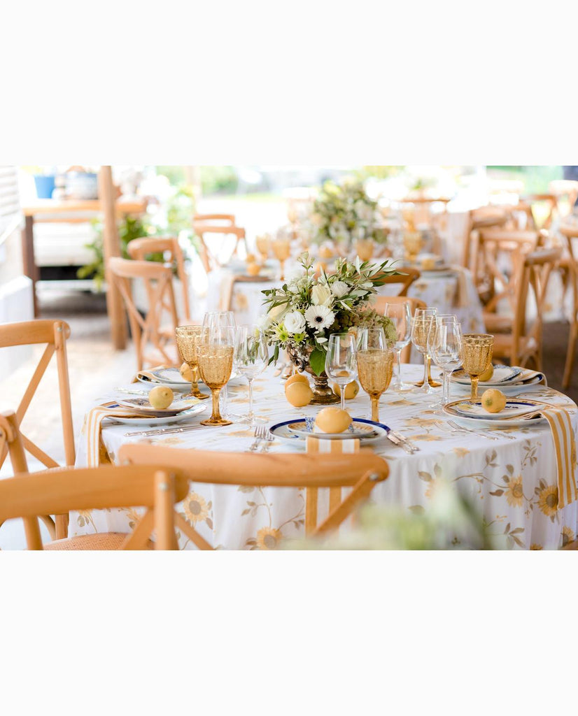 Gorgeous 200-thread-count percale cotton tablecloth with a sunflower print. Perfect for a fresh, Mediterranean-inspired table setting.