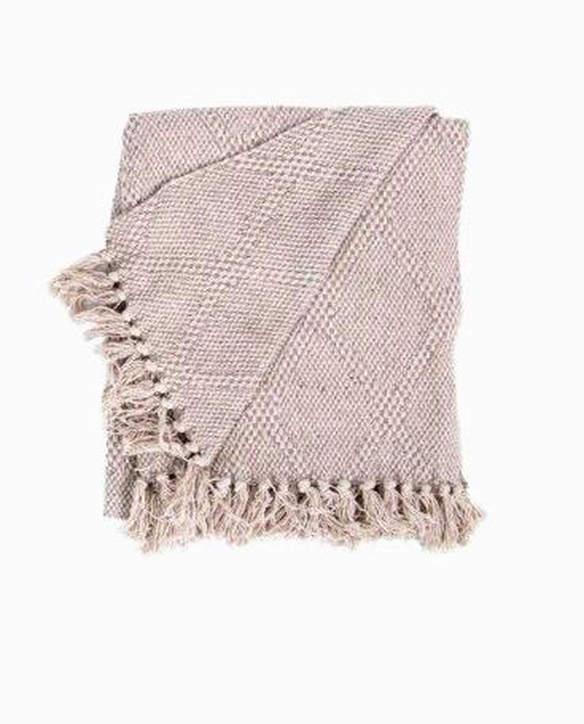 Beige kleed met ruiten heeft een typische Bohemian look door de print en franjes. Gebruik hem als decoratie voor op de bank en het geeft je ruimte direct extra sfeer.