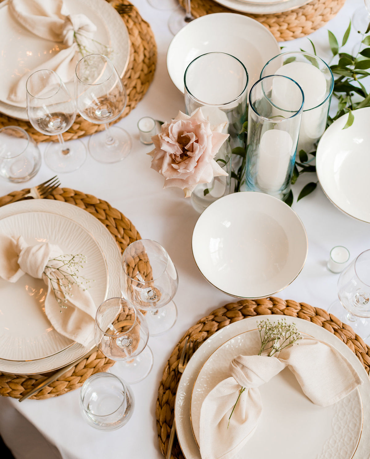 Geweven stoffen tafelkleden en rondom gezoomd.